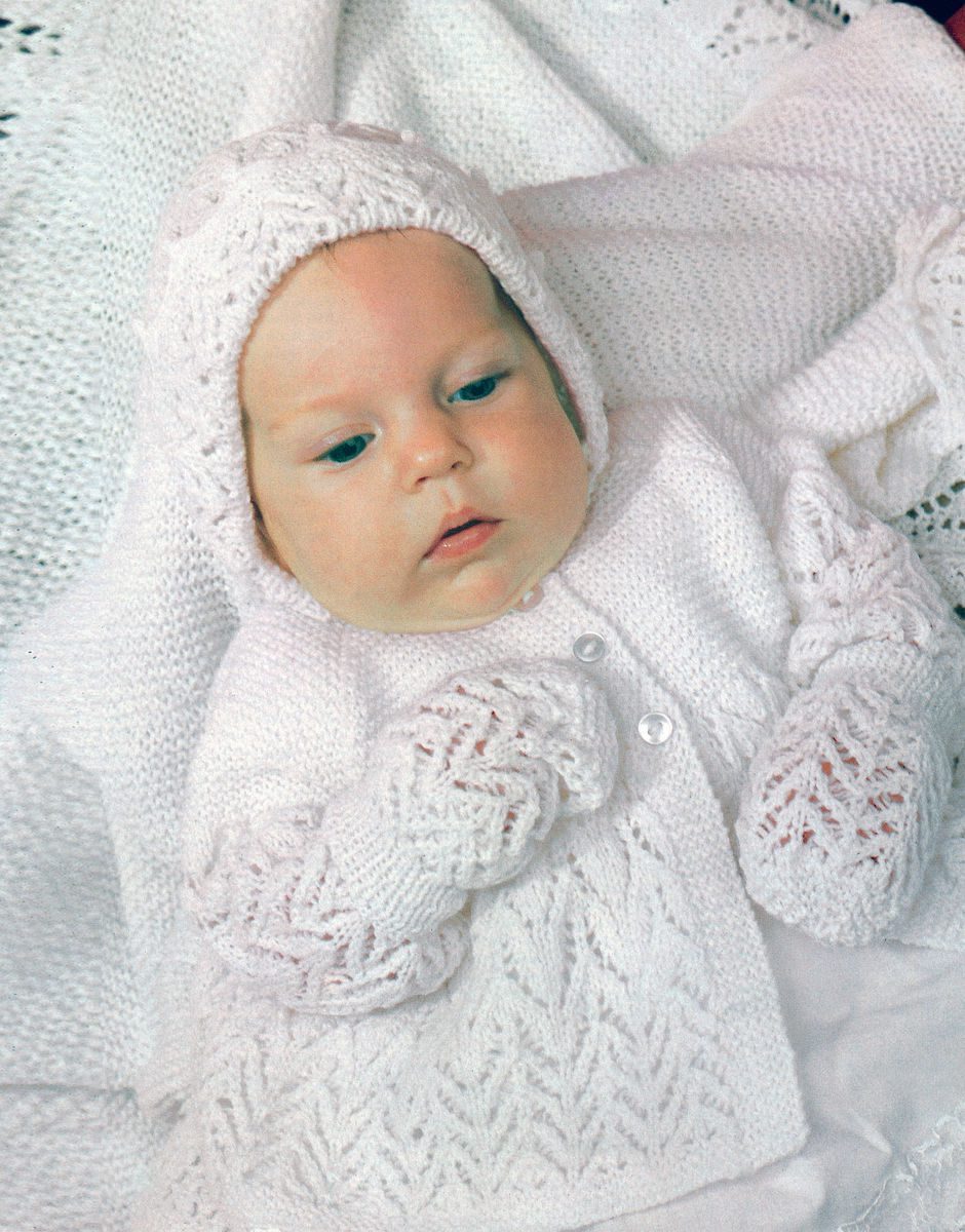 This adorable lacey set includes a matching coat, bonnet, booties, mittens and shawl. Finished with crochet details this is a stunning collection that can be passed down through the generations. Knitted in our high quality Sirdar Snuggly 3 Ply, these pieces can be machine washed and dried.
