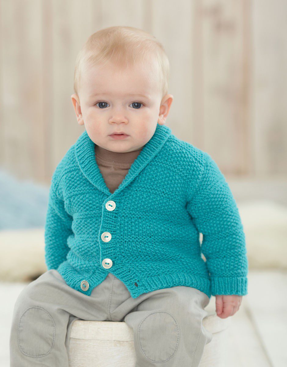 With textured stripes of garter and moss stitch and rib trims, this cardigan pattern includes the option for a v-neck or cosy shawl collar. With instructions for sizes from sizes from newborn to seven years.
