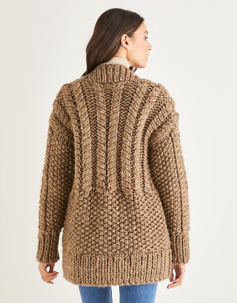 In super chunky Sirdar Adventure, the combination of moss stitch, cables and wide ribs in this longline cardigan won’t take all season to knit. Cast-on soon and stay toasty all winter.