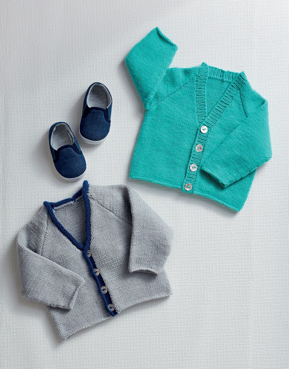 You will also need: Single Point Needles 4mm (USA 6), Single Point Needles 3.25mm (USA 3) for the V-neck and striped cardigan and 4 [4:4:5:5:5] buttons for each cardigan.