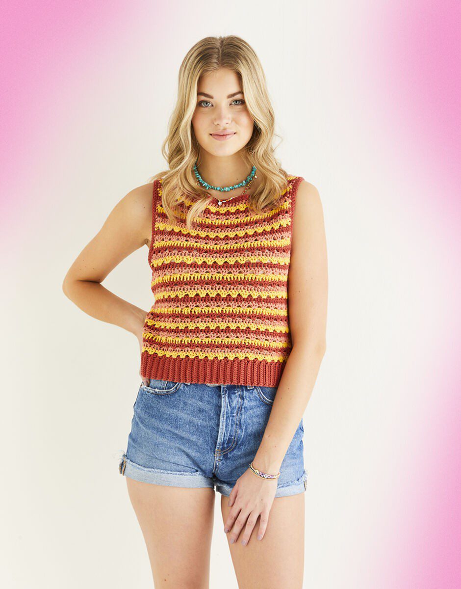 For this striped tank top pattern, you’ll crochet eyelet stripes to give you a cool lace effect, making this garment a great breathable piece for summer. Wear with the matching Backstage Bucket hat pattern for a cool crochet look this season.