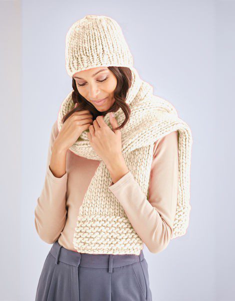This super chunky hat and scarf set in the soft roving style wool blend of Sirdar Adventure make a super quick knit. With a range of sophisticated melange shades to choose from, you can knit a set to match each of your favourite winter coats.