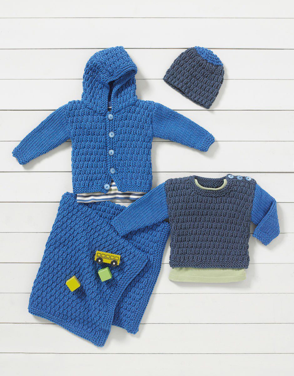 Matching baby jacket with hood, sweater, hat and blanket, featuring colour blocking and textured stitches. Designed for babies from birth to 3 years in machine washable Sirdar N o1 DK.