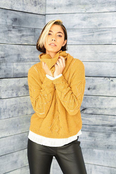 The contrast of textures makes this sweater and tunic must knit garments. Delicate lace stitch on the front and sleeves combined with Irish moss stich on the sides create some lovely details. The longline tunic also has a side slit and there is a matching snood to complement both outfits.