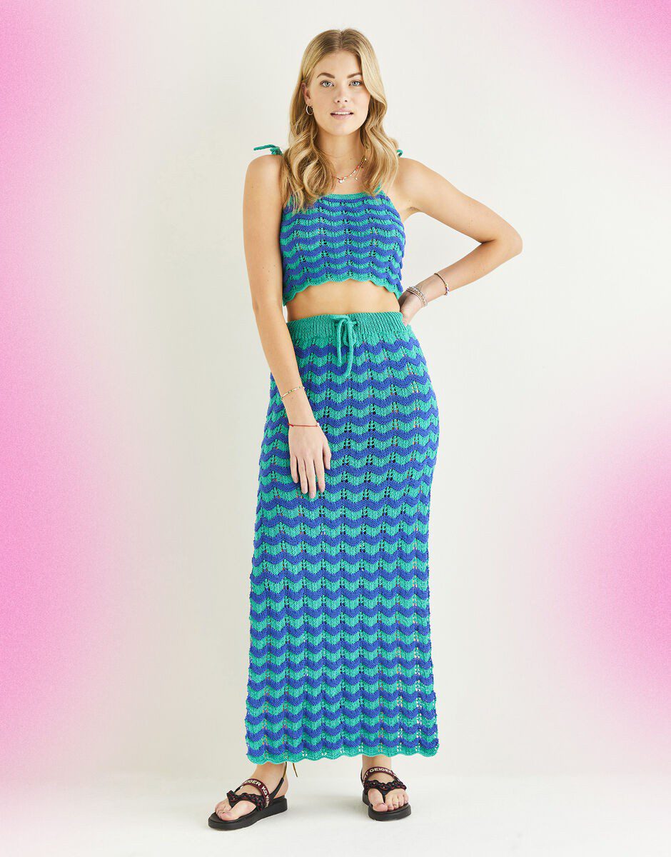Chevron stripes meets festival mermaid. For this two-piece maxi skirt and cropped top pattern, you’ll knit chevron stitch to construct the scalloped hem and then reverse stocking stitch to continue the chevron pattern throughout the garment. This design also involves knitting garter stitch and icord ties for the top, so a great advanced knit to challenge yourself with.