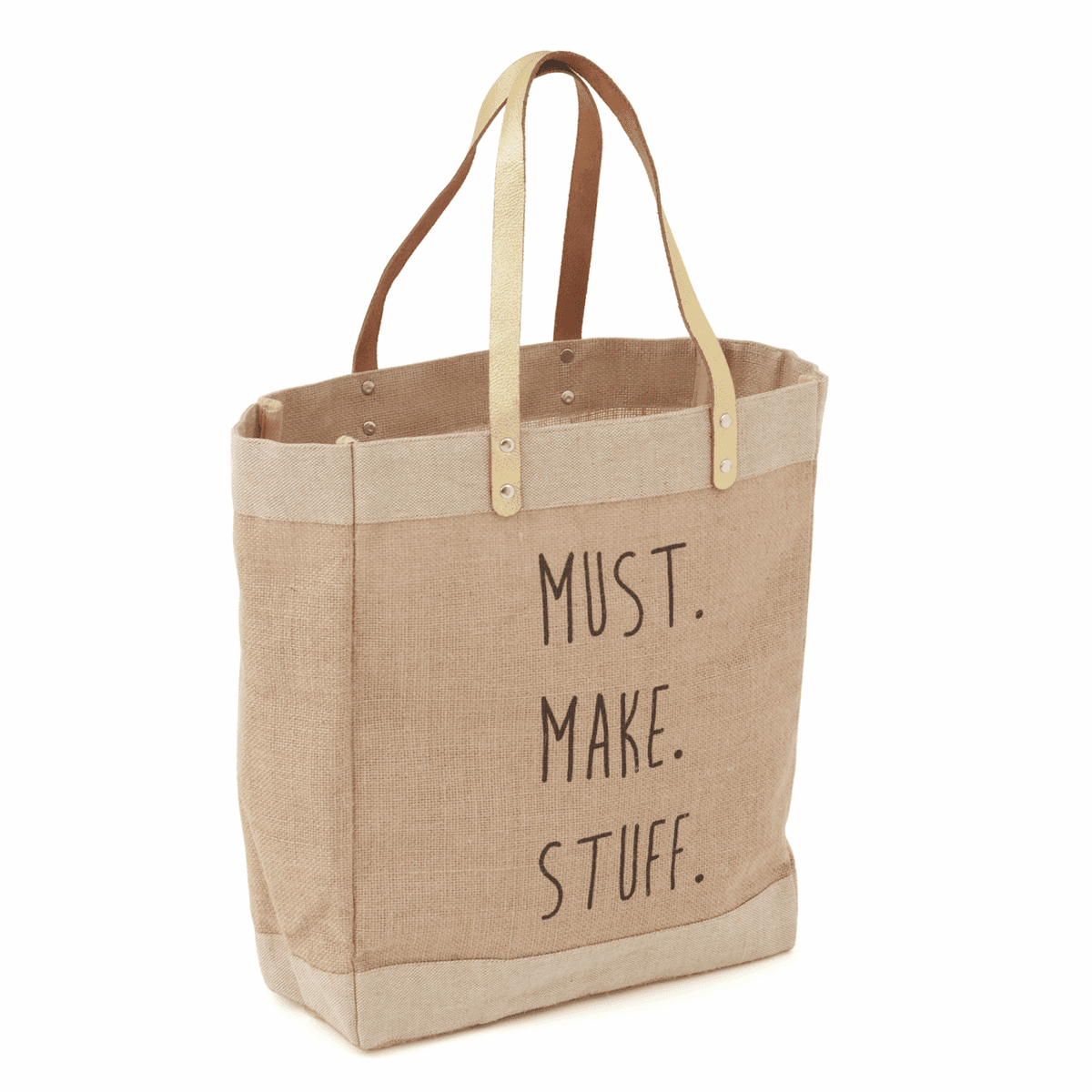 Stylish tote bag made from natural coloured linen and hessian with long gold leather handles. ‘Must Make Stuff’ design. Spot clean only. d/w/h: 15 x 34 x 40cm.