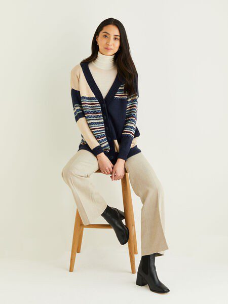 The seemingly random placement of the Modern Fair Isle pattern on this cardigan has actually been carefully considered by our designers to create a quirky, on-trend patchwork effect. The effect continues onto the back which is made from two panels seamed down the centre. This fun project for more experienced knitters is bound to draw attention to your knitting skills when you wear it.