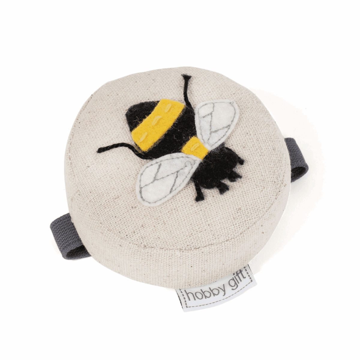 Wearable wrist Pincushion with elasticated wrist strap. Appliqué felt bee design. Spot clean only. d/w/h: 7.5 x 7.5 x 3cm.