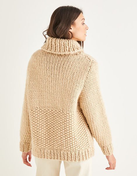 We love winter walks in the great outdoors. We also love cosying-up on cold winter nights. This super chunky roll neck sweater with moss stitch detail is perfect for outdoor adventures as well as evenings by the fireside.