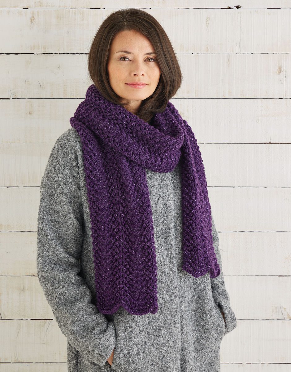 Create waves with this set of two sparkly scarves. With the option of a fan and feather style, or a zig zag style, these textured stitches look great knitted up in Hayfield Glitter double knitting.