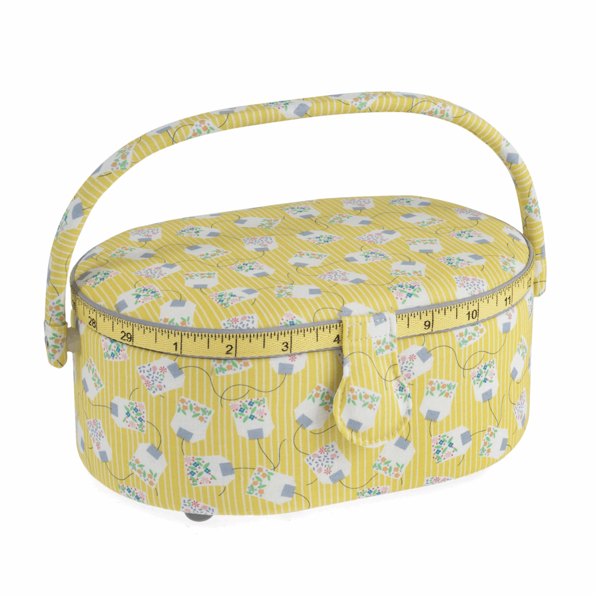 Small oval sewing box made from 100% cotton fabric. Lid with press stud fastening. Fabric covered handle. Hard plastic internal tray with compartments for sewing notions. Internal pocket and pincushion inside lid. Spot clean only. d/w/h: 10 x 23 x 18cm.