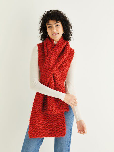 This garter stitch scarf has a push-through slot for no-fuss styling. The matching mitts are in stocking stitch with garter stitch trim, keeping this fashionable, super chunky set super simple for new knitters and super speedy for everyone else.