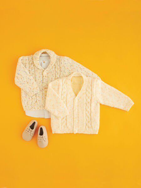 Cute little cable cardigans for baby made all the cuter with a sprinkling of Baby Bonus Spots. Knit the everyday v neck cardigan then add the shawl collar version for days when baby needs to be extra cosy. Knitting Level: Intermediate