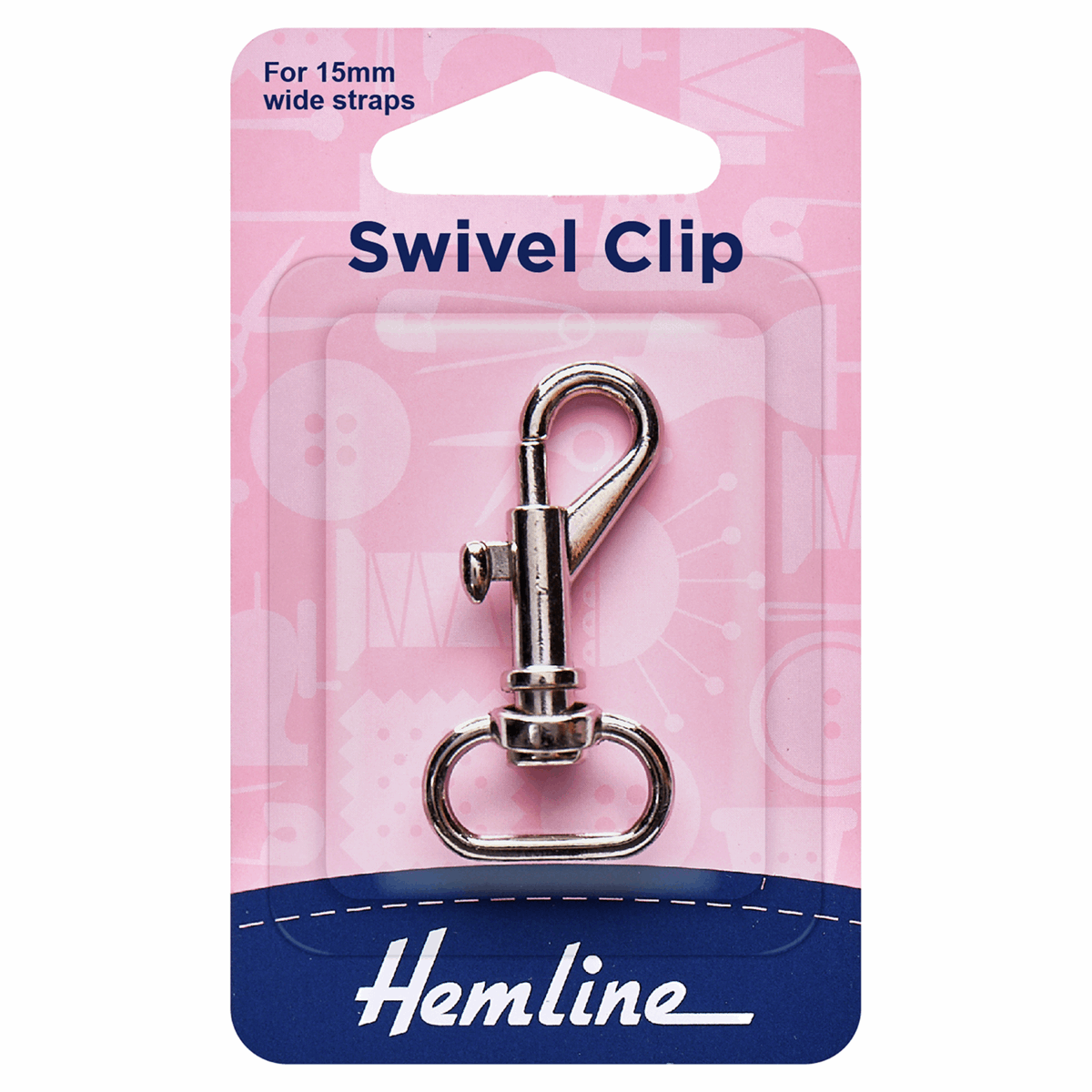 Swivel clips fit to straps, cords, ribbons etc. They are often used as a way of keeping small items together – for example on a key ring. Nickel – 15mm, 5/8in. 1 piece.