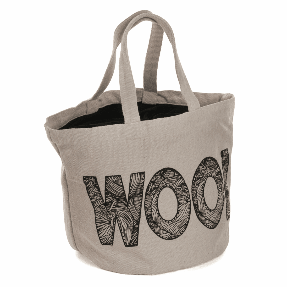 Capacious bucket style bag with ‘Wool’ logo. Made from 100% cotton. Great for storing yarn or transporting knitting projects. Spot clean only. d/w/h: 32 x 50 x 32cm.